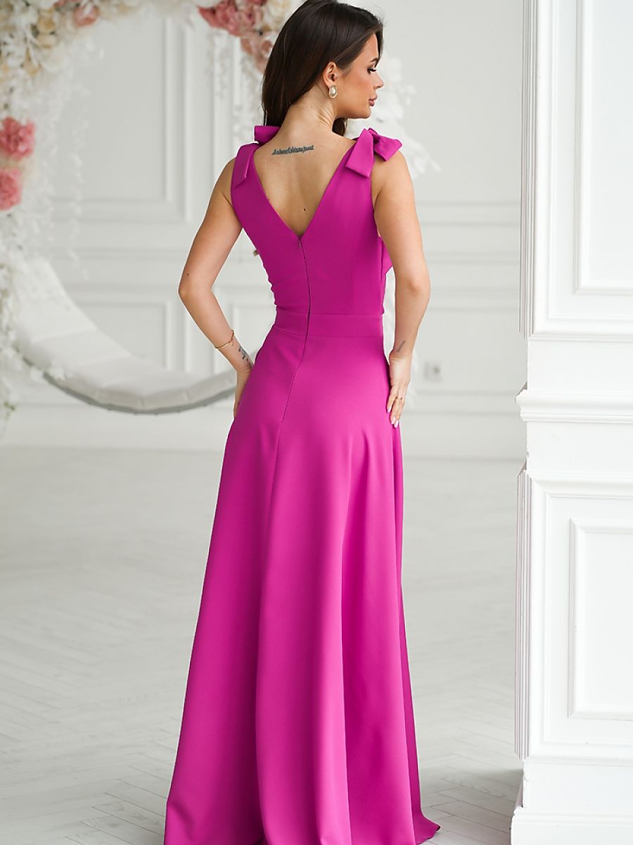 Rochie Lungă Fucsia cu Decolteu V și Crăpătură