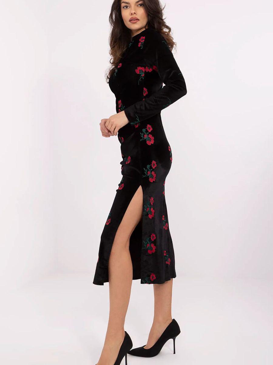 Rochie de seară elegantă de tip creion, care subliniază silueta feminină și adaugă eleganță oricărei ținute. Fabricată dintr-o amestec de înaltă calitate de bumbac, poliester și elastan, asigură confortul și o potrivire perfectă. Florile brodate conferă rochiei un caracter romantic deosebit, iar pliurile decorative modelează subtil figura. Lungimea midi și mânecile lungi fac ca creația să arate extrem de stilată și elegantă. Decolteul neobișnuit adaugă originalitate, accentuând gâtul și umerii. Lipsa închiderii face ca rochia să fie comodă de purtat. Este o alegere excelentă pentru ocazii speciale, petreceri elegante sau seri elegante.